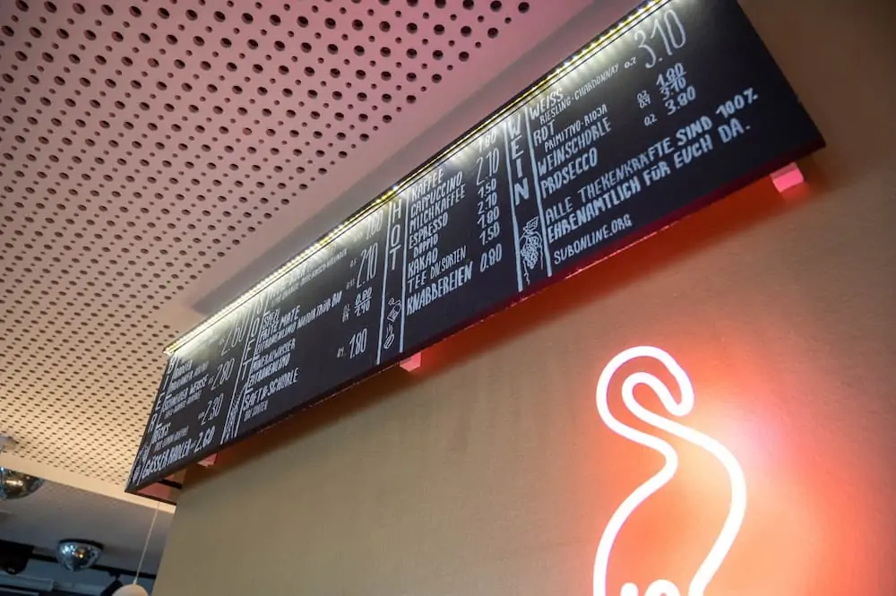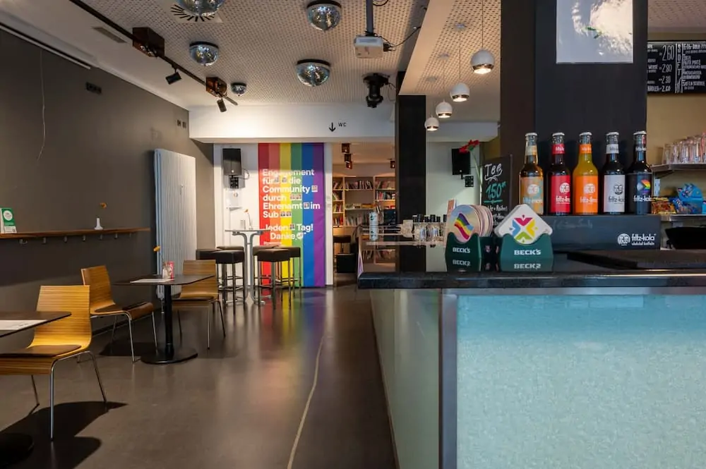 Das Café im Sub ist Treffpunkt für alle die sich mit ih- ren Freund*innen treffen oder neue Bekanntschaften schließen wollen - oder herausfinden möchten, was in der schwulen Szene Münchens los ist. Das Café bietet eine große Auswahl an Getränken – Säften, Tees, Bieren, Longdrinks - zu günstigen Preisen und wird vollständig von ehremamtlichen Helfer*innen betrieben.