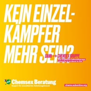 Du hast genug von Chems? Du willst die Kontrolle über Dein Leben zurück? Dieses strukturierte Programm wurde speziell für Chemsex-User entwickelt und widmet sich den sexuellen, körperlichen, sozialen und suchtspezifischen Themen, die Chemsex mit sich bringen kann. Dieses Programm mit anderen Männern in der Gruppe zu durchlaufen, könnte genau das Richtige für Dich sein, um Dein Leben und Sex ohne Chems wiederzuentdecken! Die Gruppe ist Abstinenz-orientiert, also für Männer die schon aufgehört haben Chems zu nehmen oder den festen Willen haben aufzuhören.